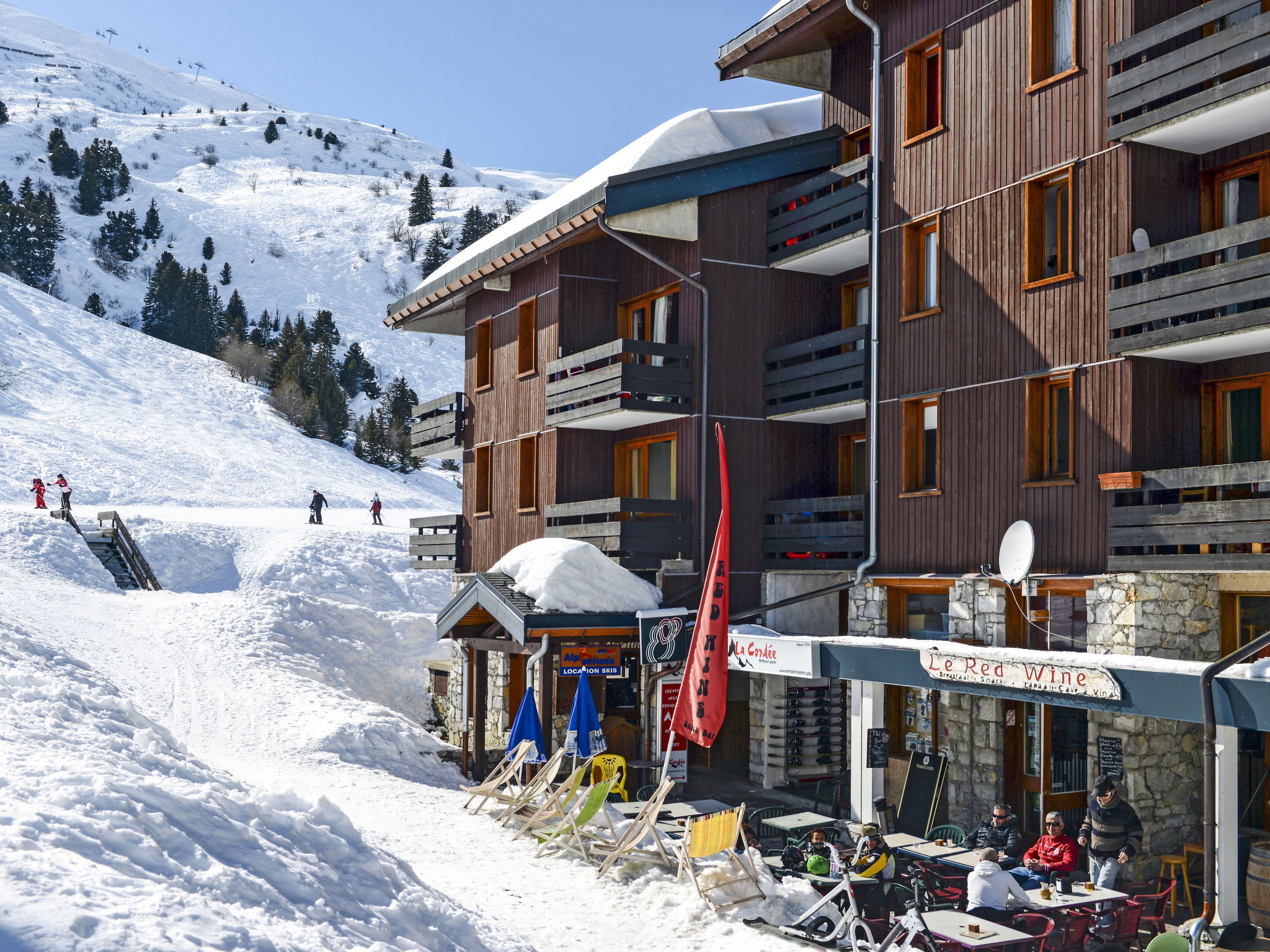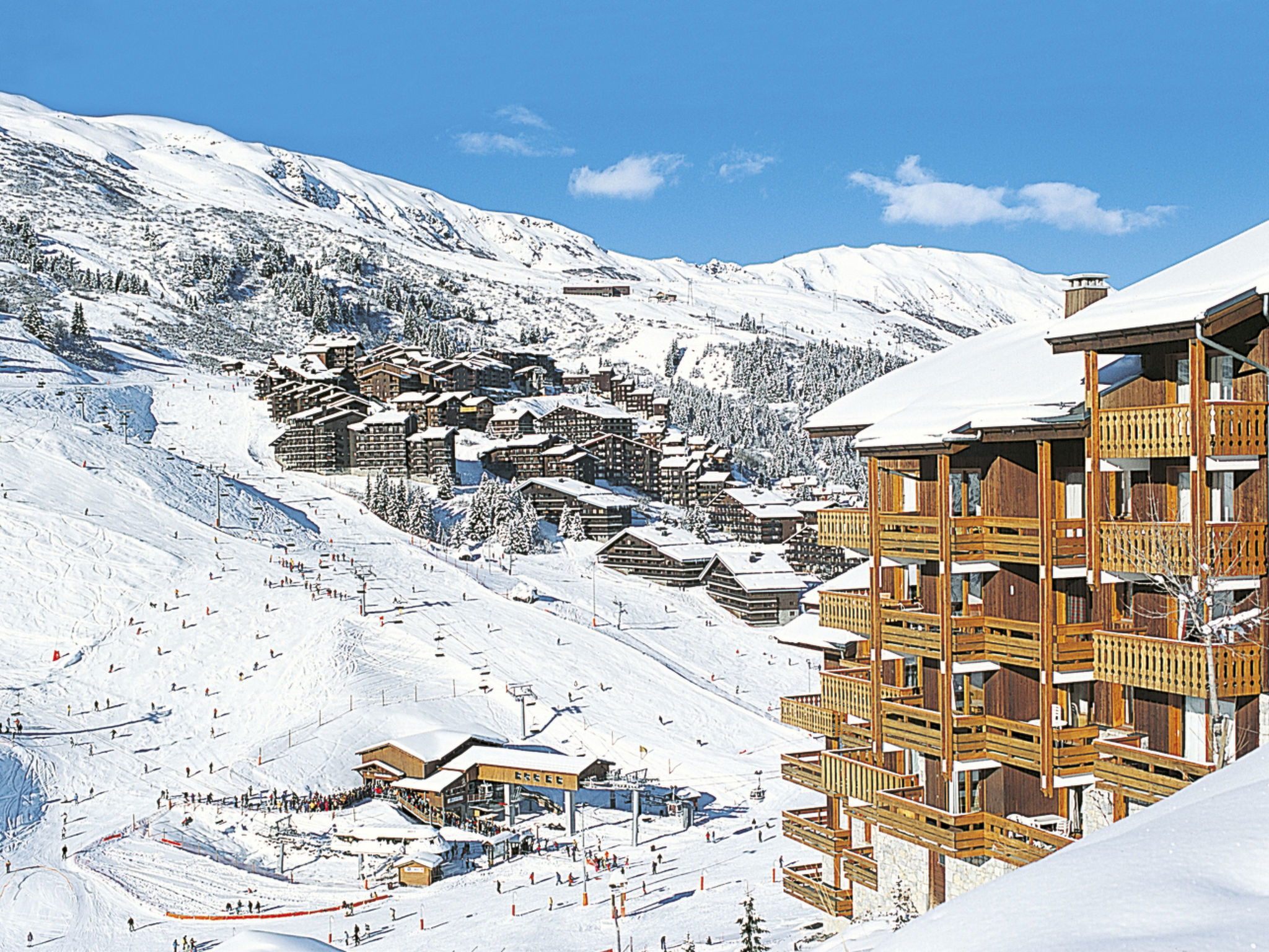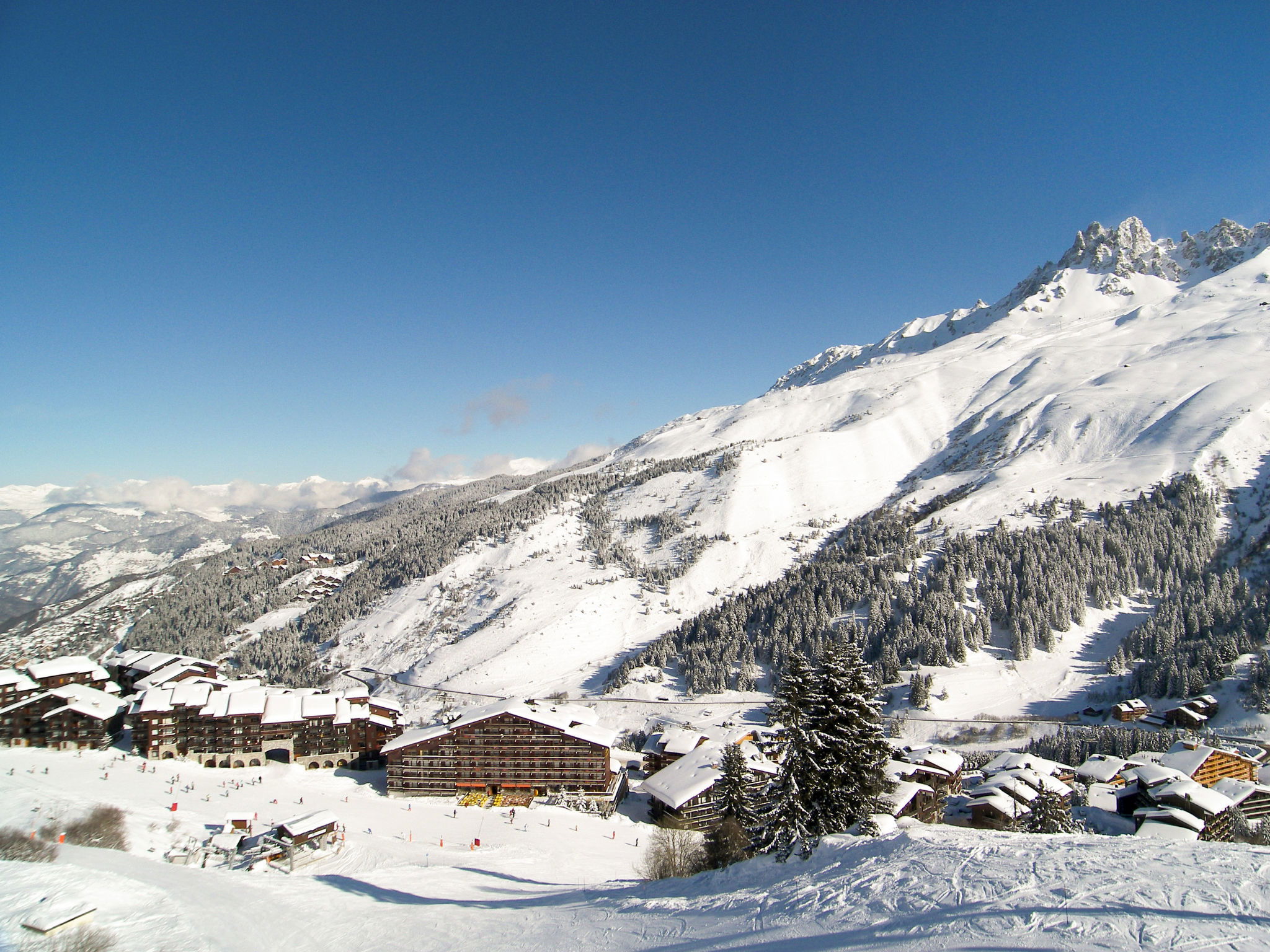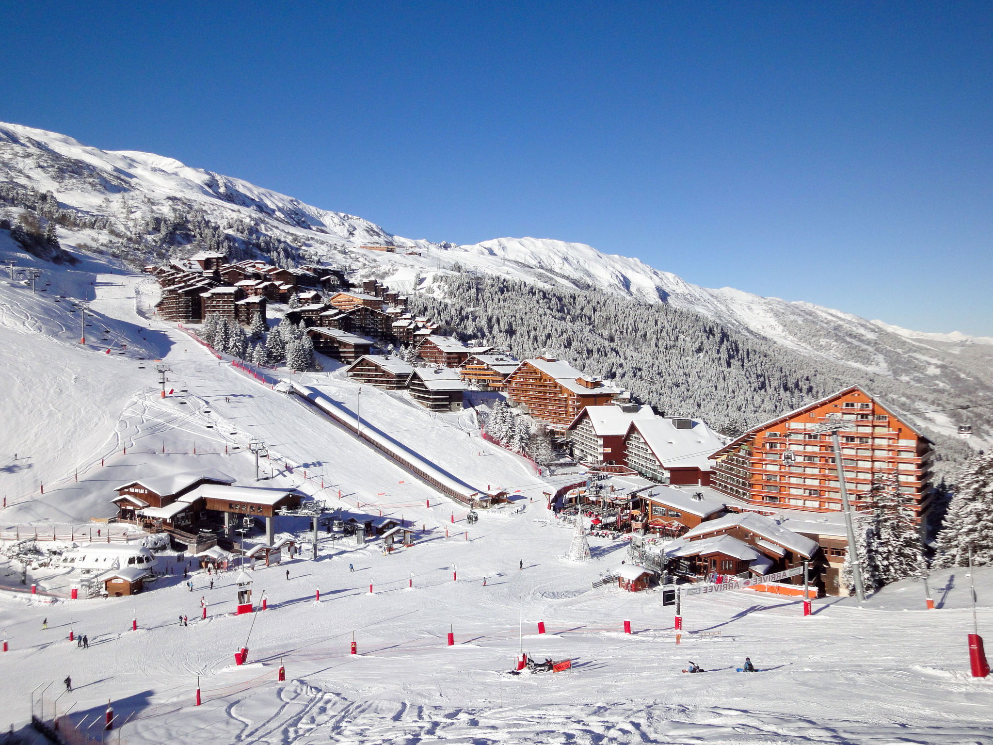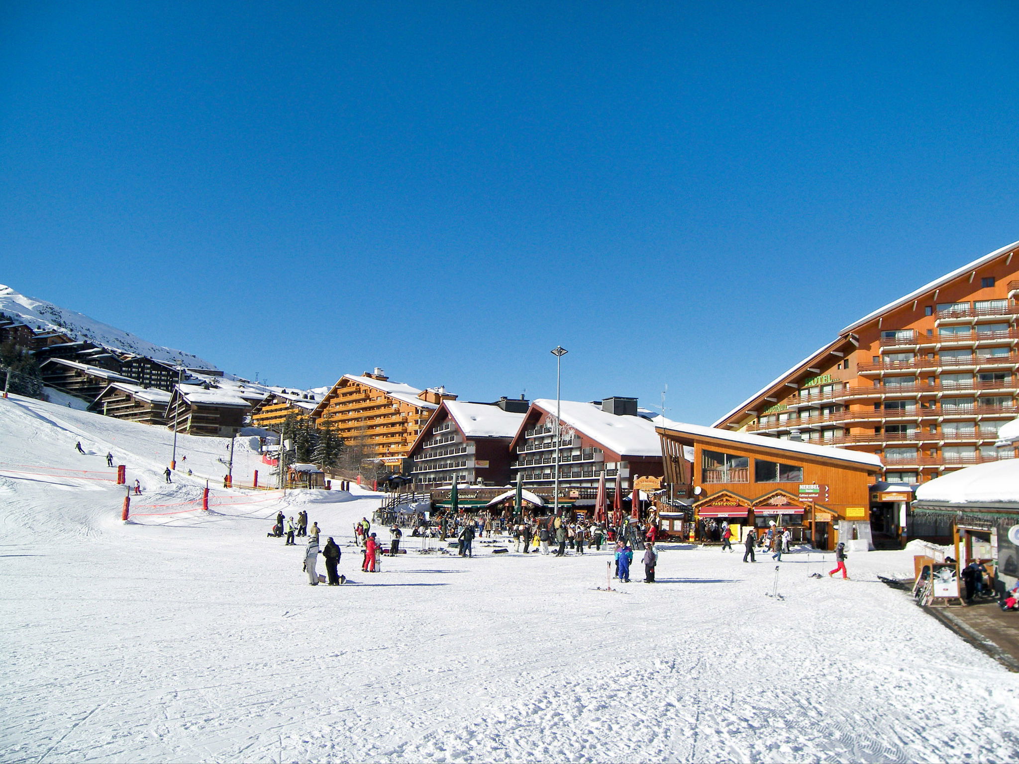 Beautiful, rustic residence "Odalys - Le Hameau du Mottaret", 1'800 m a.s.l.. In the district of Méribel-Mottaret, 3.5 km from the centre of Méribel, 25 km from the centre of Moutiers, in an elevated position on a slope, directly by the skiing area. In the complex: lounge, WiFi (extra). Playroom, storage room for skis, washing machine (for shared use, extra). Communal covered parking (extra). Parking space or garage only for small to medium-sized cars. Dimension: height 200 cm. Shop 500 m, restaurant 1.3 km. Walking paths from the house, slopes 50 m, ski rental 100 m. Well-known ski regions can easily be reached: Les 3 Vallées. Please note: the photograph shows a typical example. The holiday properties may differ in living space, floorplan, equipment and furnishing.