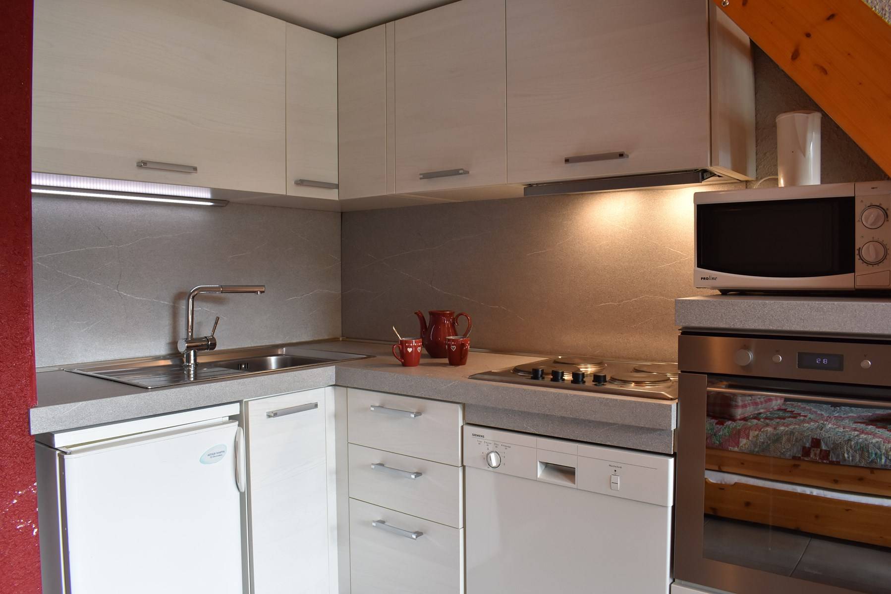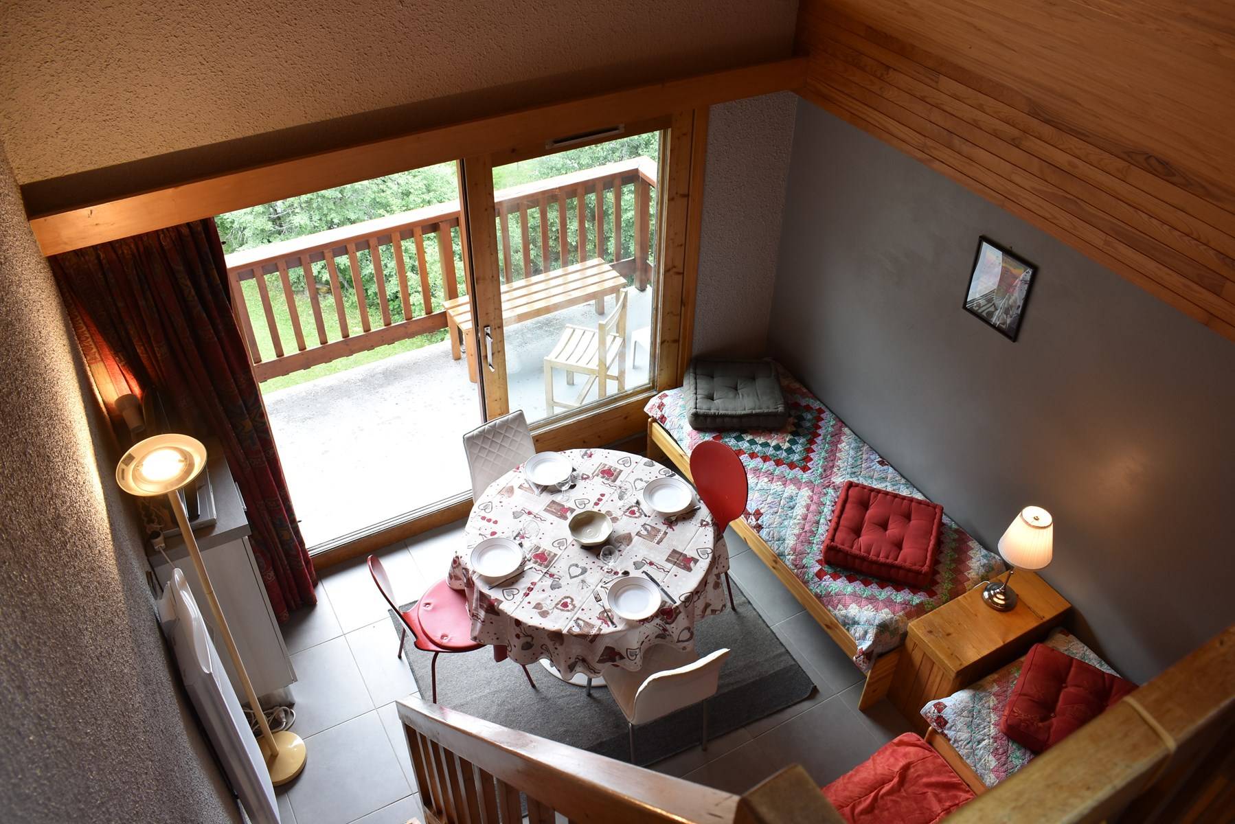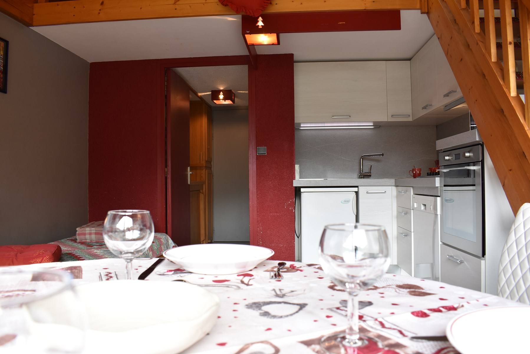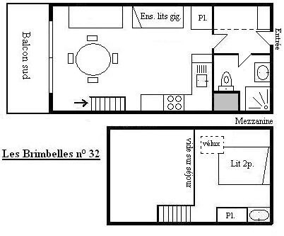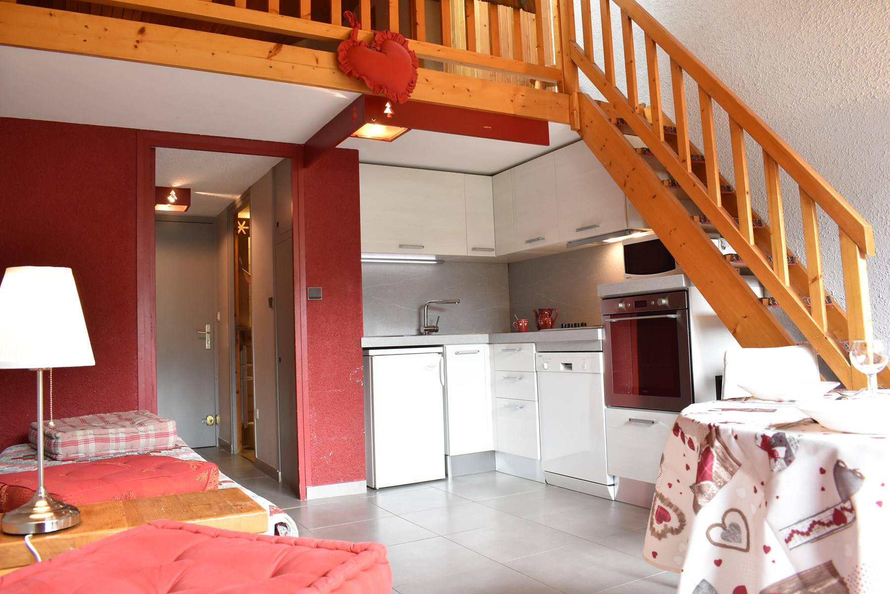 This apartment in the mountains located on the 6th floor, with lift, includes an equipped kitchen open to a living room with a dining area, 1 single bed and 1 set of pull-out pull-out beds with a south-facing balcony, a shower room with a WC . The floor includes a south-facing sloping mezzanine with 1 low double bed 160 and a sink area. It is necessary to walk up 1 floor when exiting the elevator to access the apartment.