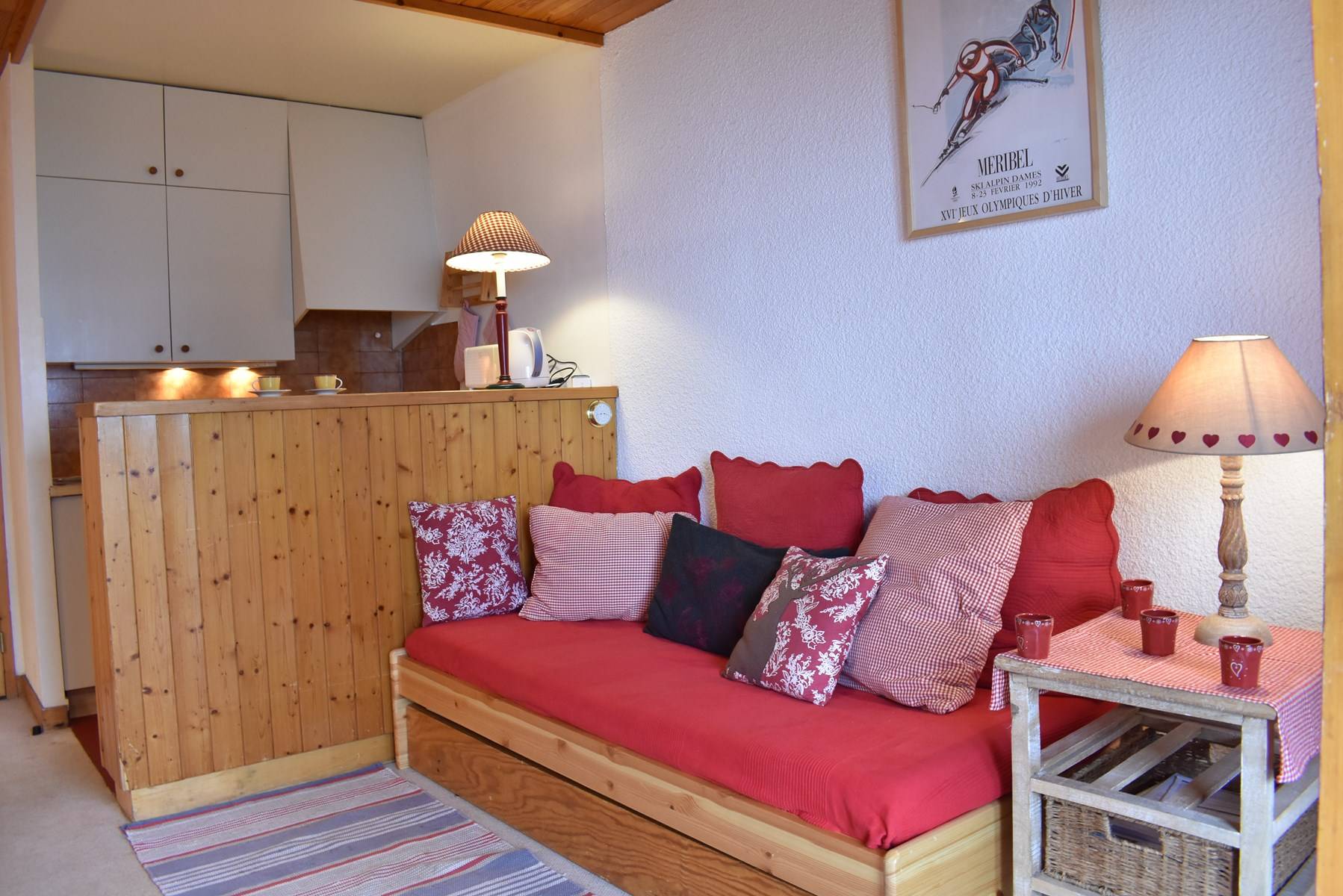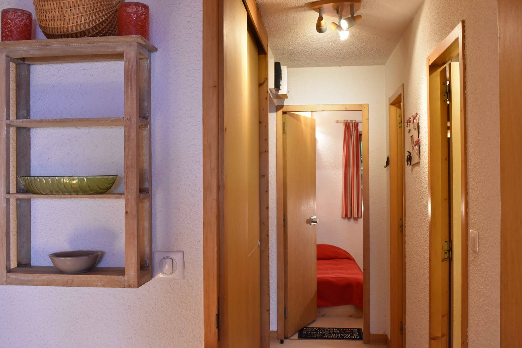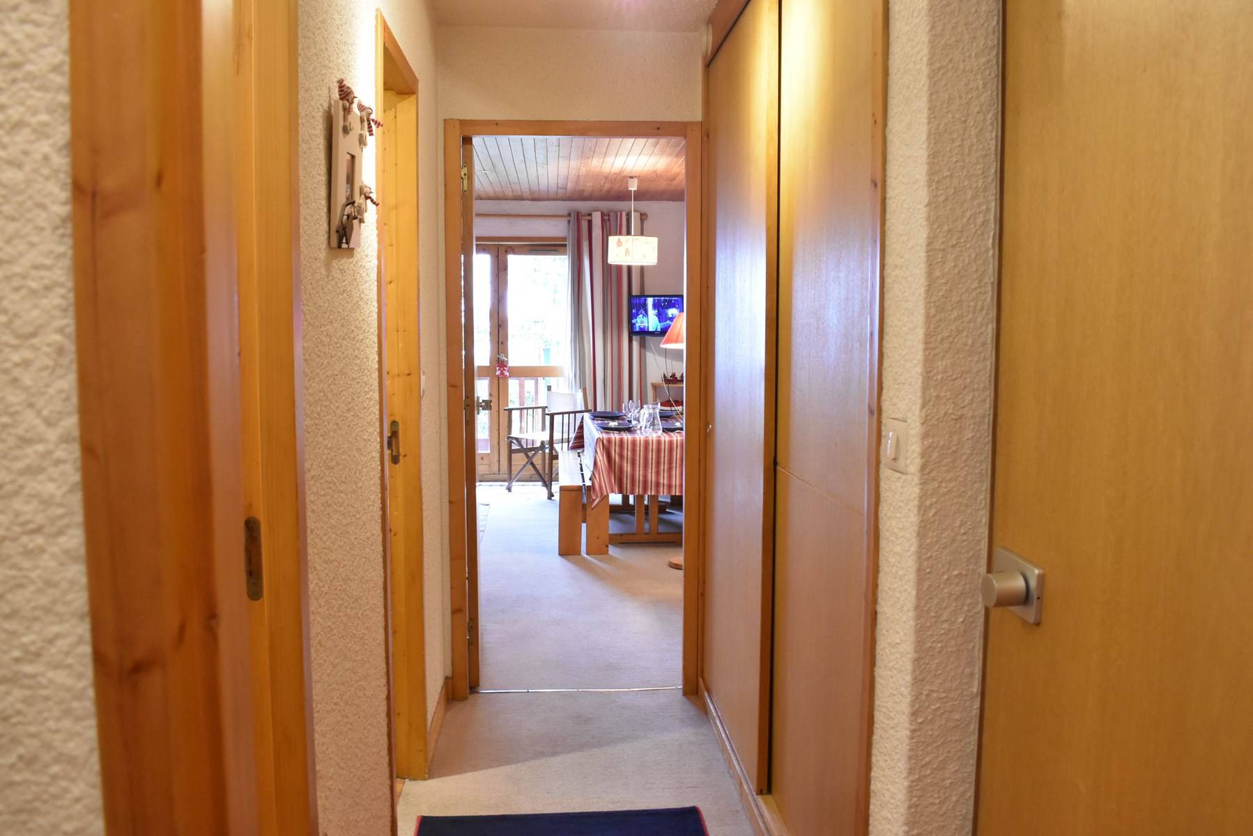 This apartment, accessible by lift, is on the floor of the residence. It includes an equipped kitchen open to the living room with a set of pull-out trundle beds and a television with integrated DVD player, a bedroom with 2 single beds, a bathroom and a separate toilet. A ski locker is available at the entrance of the residence.