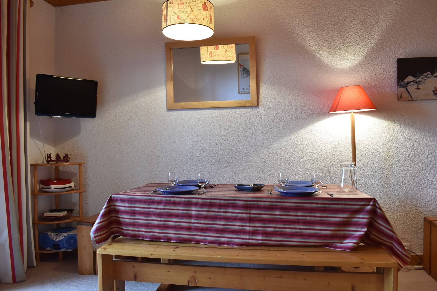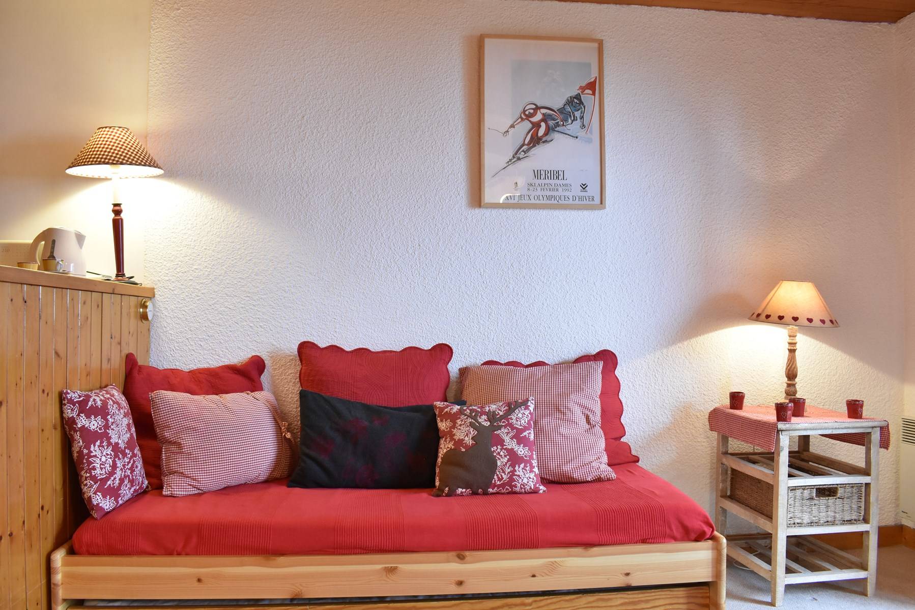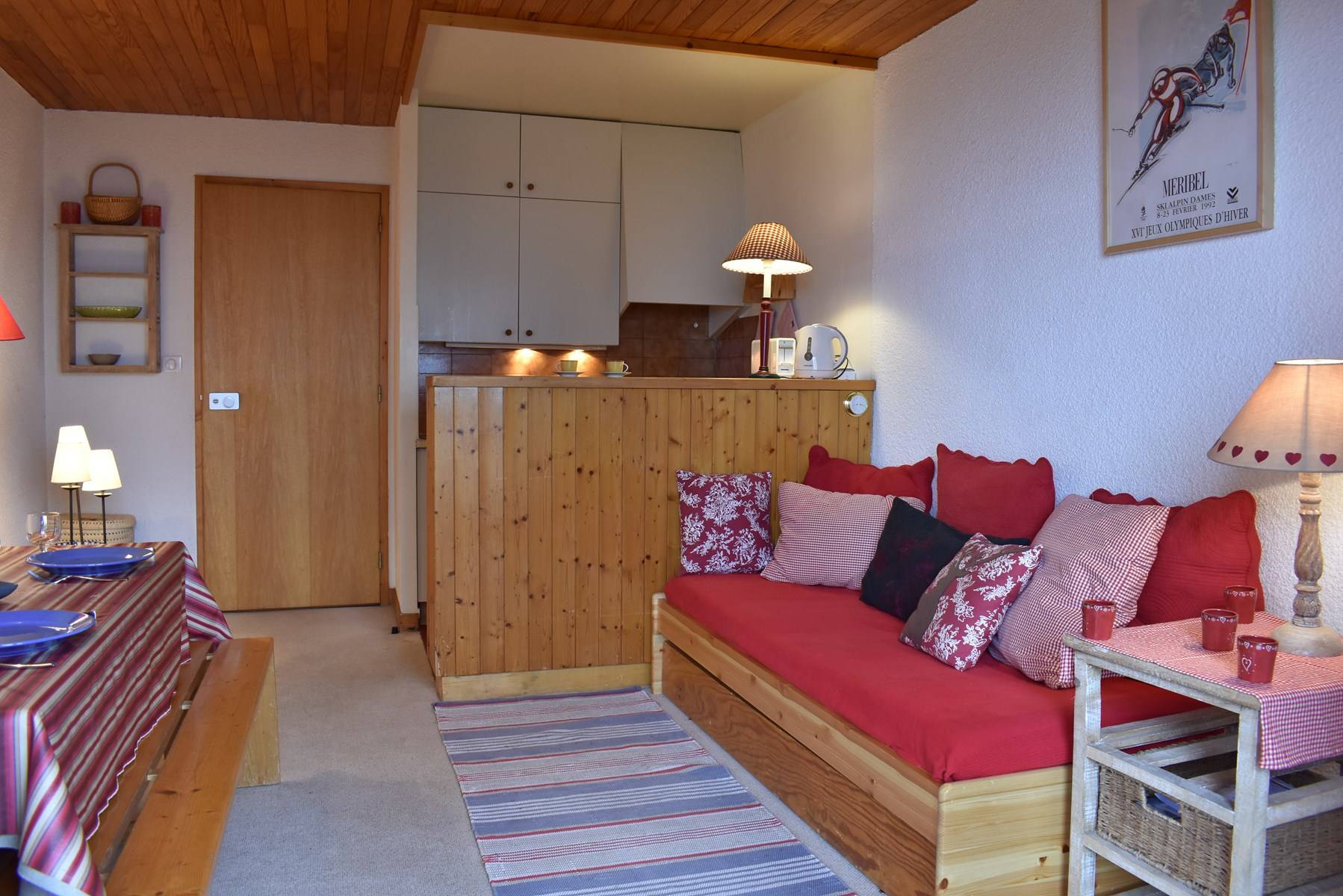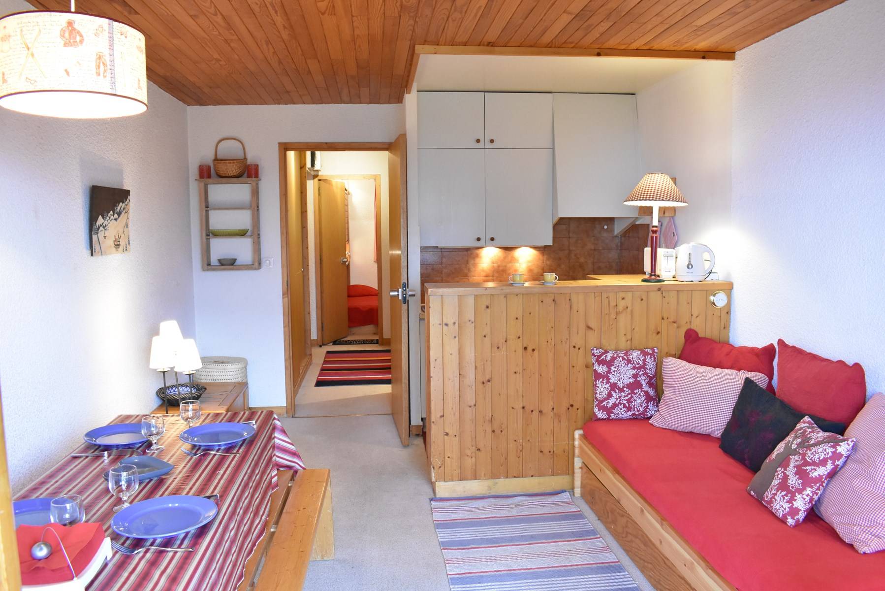 This apartment, accessible by lift, is on the floor of the residence. It includes an equipped kitchen open to the living room with a set of pull-out trundle beds and a television with integrated DVD player, a bedroom with 2 single beds, a bathroom and a separate toilet. A ski locker is available at the entrance of the residence.