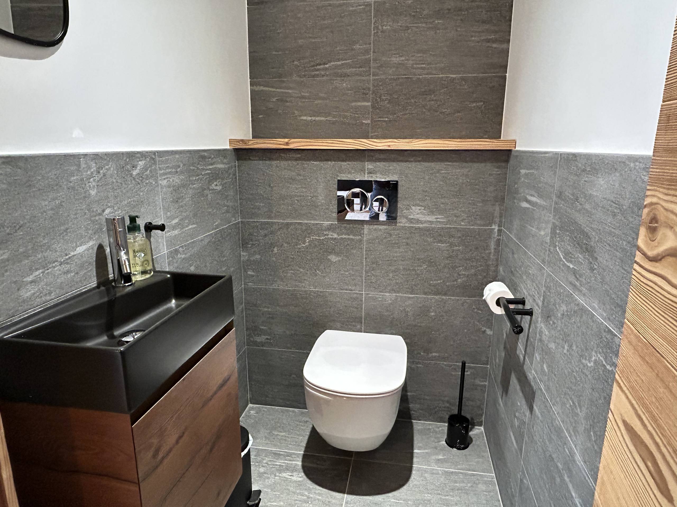 The bathroom is modern and has a large walk-in shower. The toilet is separate for convenience.