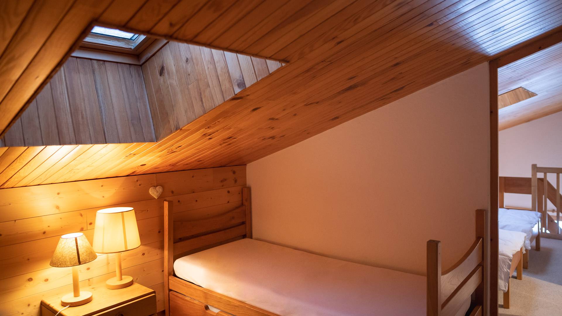 Bedroom with double bed (140x190). Kitchen equipped with ceramic hob, oven, dishwasher, refrigerator, kettle, toaster, coffee maker. Bathroom and separate WC. Upstairs, two single beds (80x190) on the mezzanine. Attic room containing two single beds and a trundle bed (80x190). Shower room with toilet. Ski locker in the residence. Non-smoking apartment. Pets forbidden.