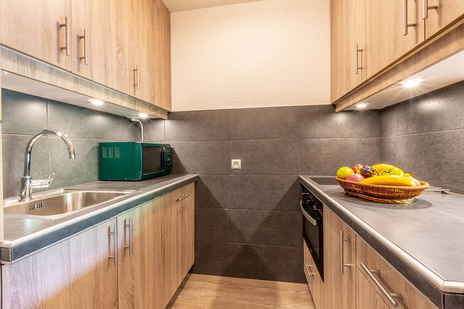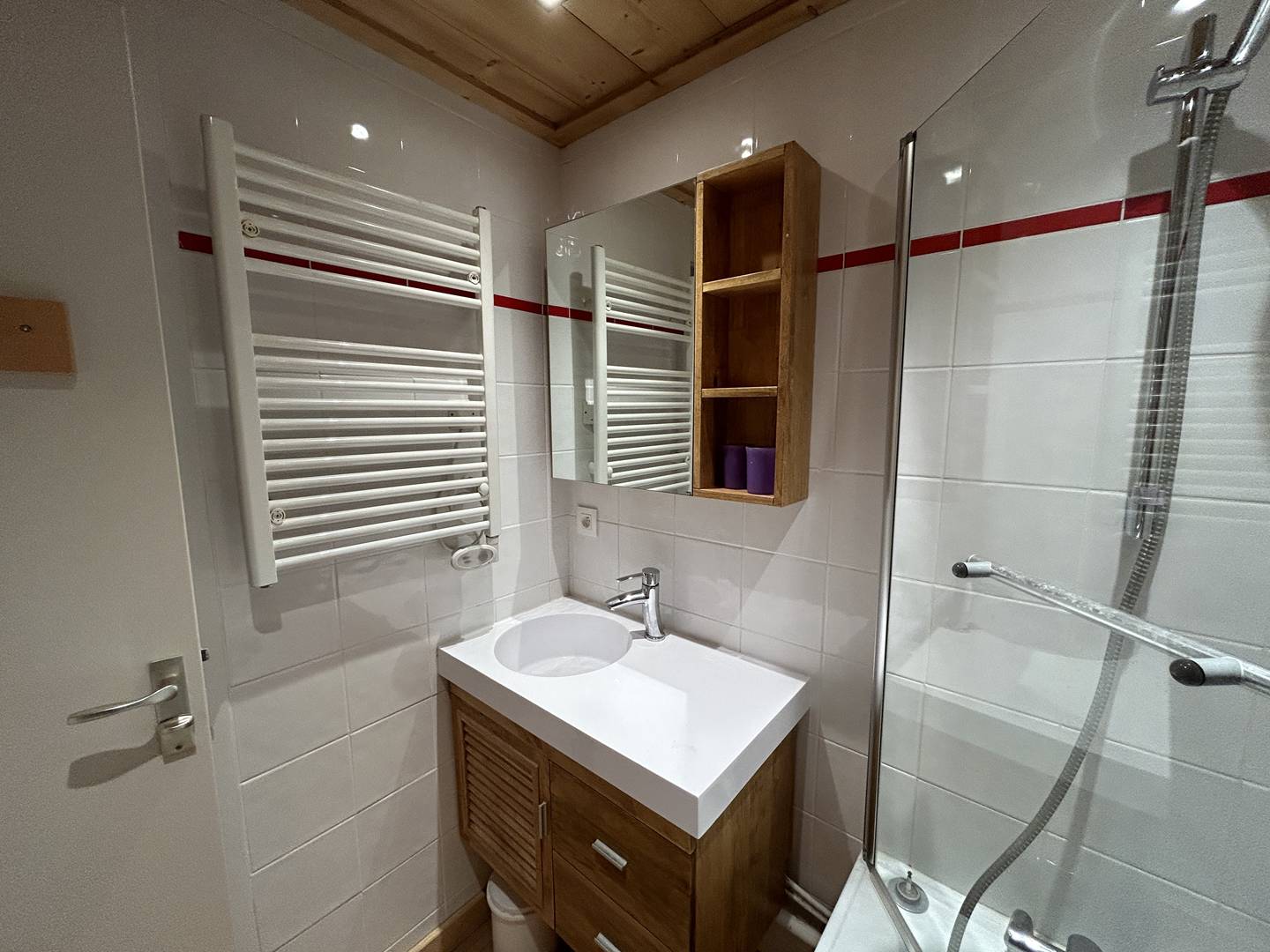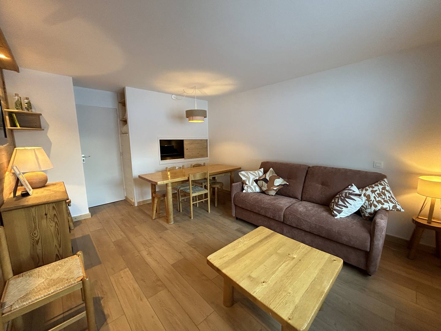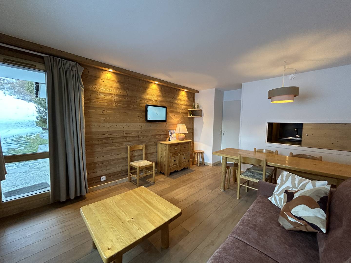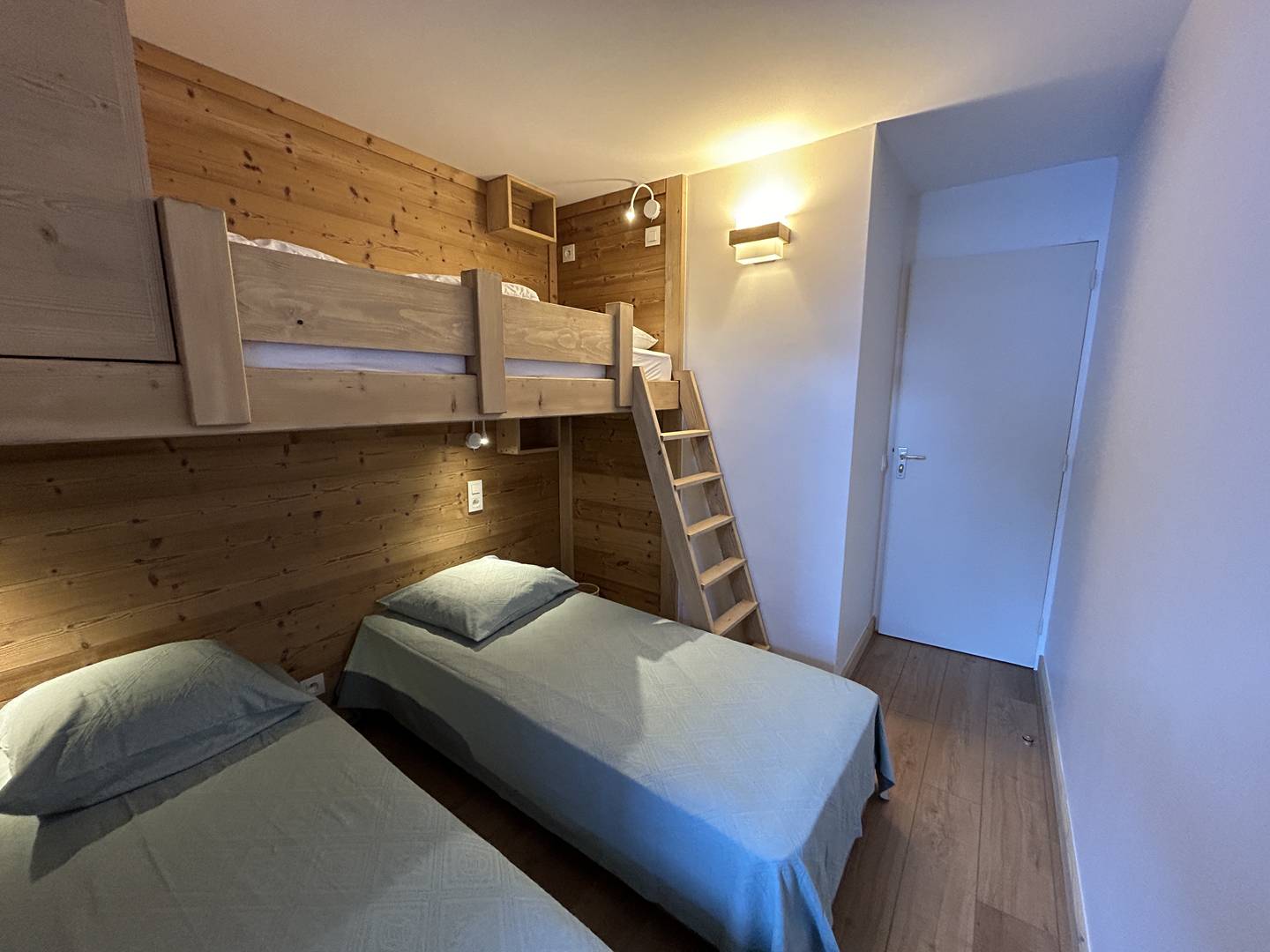 Living room extended by a terrace, equipped with a television, and a double sofa (160x200). Bedroom with a set of 2 single beds (80x190) which can be assembled and a bunk bed (80x190). Kitchen with ceramic hob, microwave, dishwasher, oven and refrigerator, kettle, toaster, coffee Nespresso Essenza. Separate bathroom and toilet. Ski locker in the residence. Non-smoking apartment. Pets not allowed. 1st floor.
