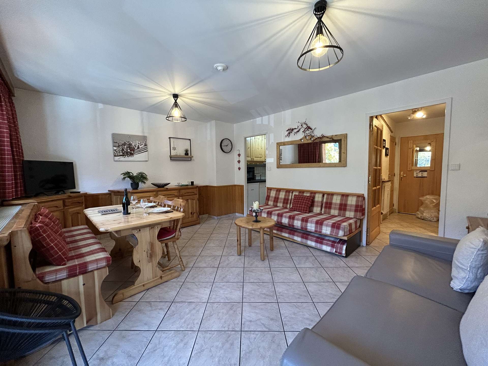 This snow flat is located on the 2nd floor without a lift and comprises a pleasant and spacious living room for 2 people with a fully-equipped kitchen with oven and dishwasher. It includes a dining area and a very cosy lounge with a 140cm sofa bed, a bench seat and a television. The living room opens onto a west-facing balcony. There is a bathroom with a heated towel rail and a separate WC.