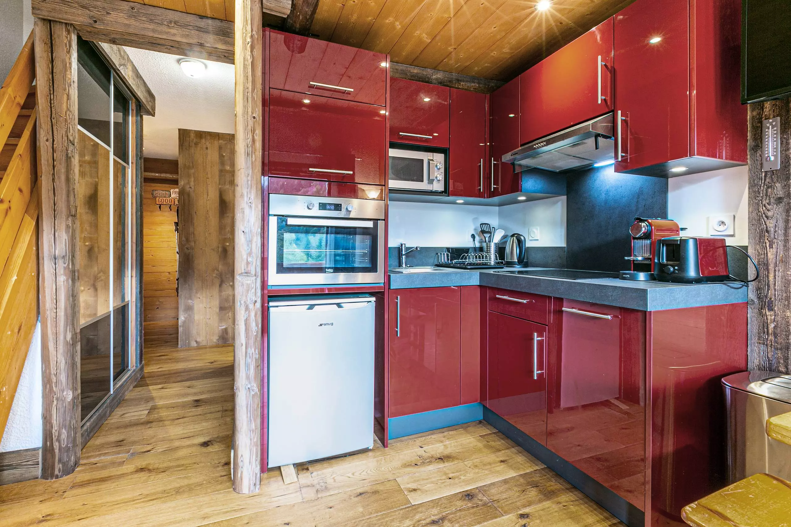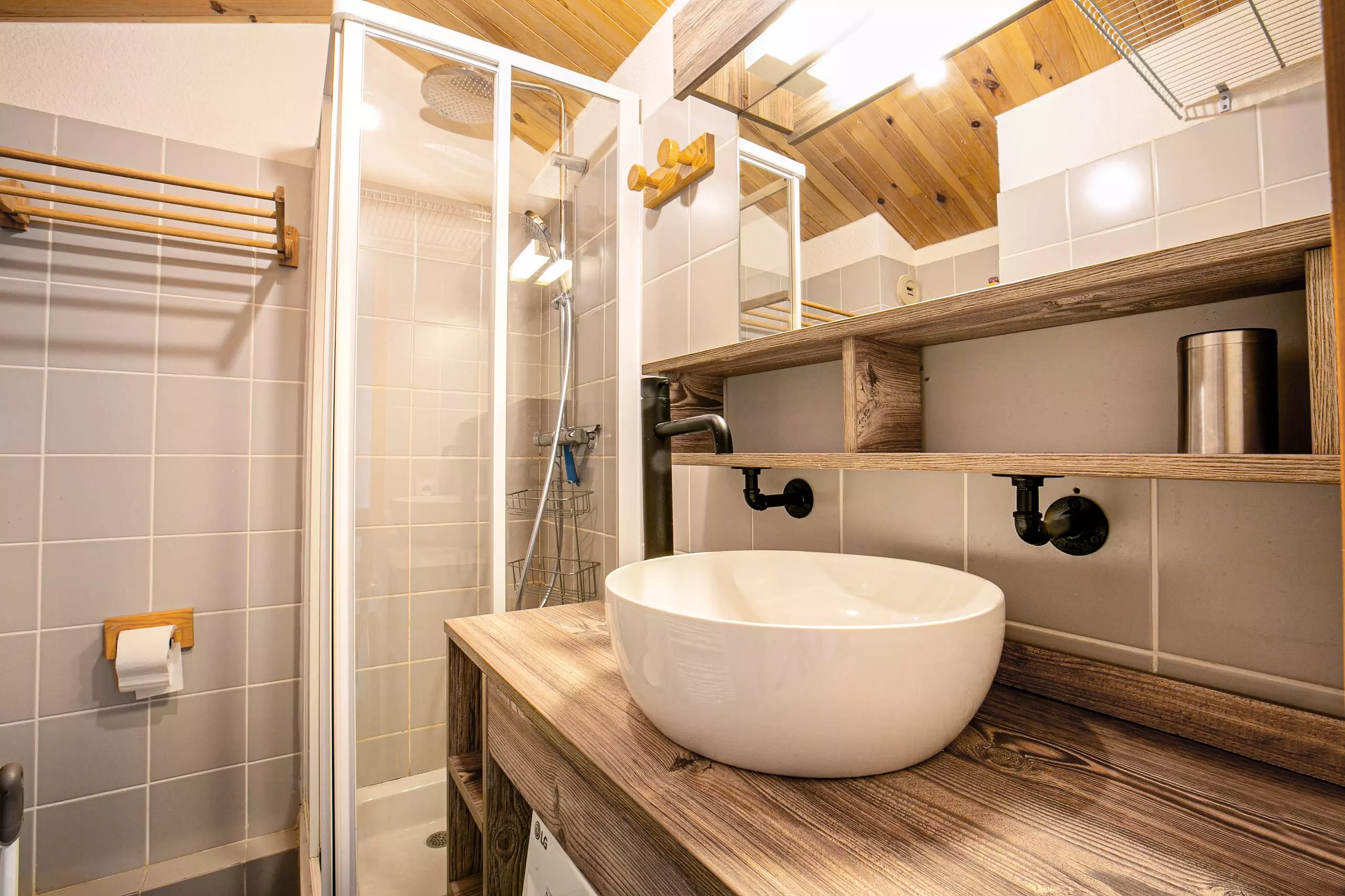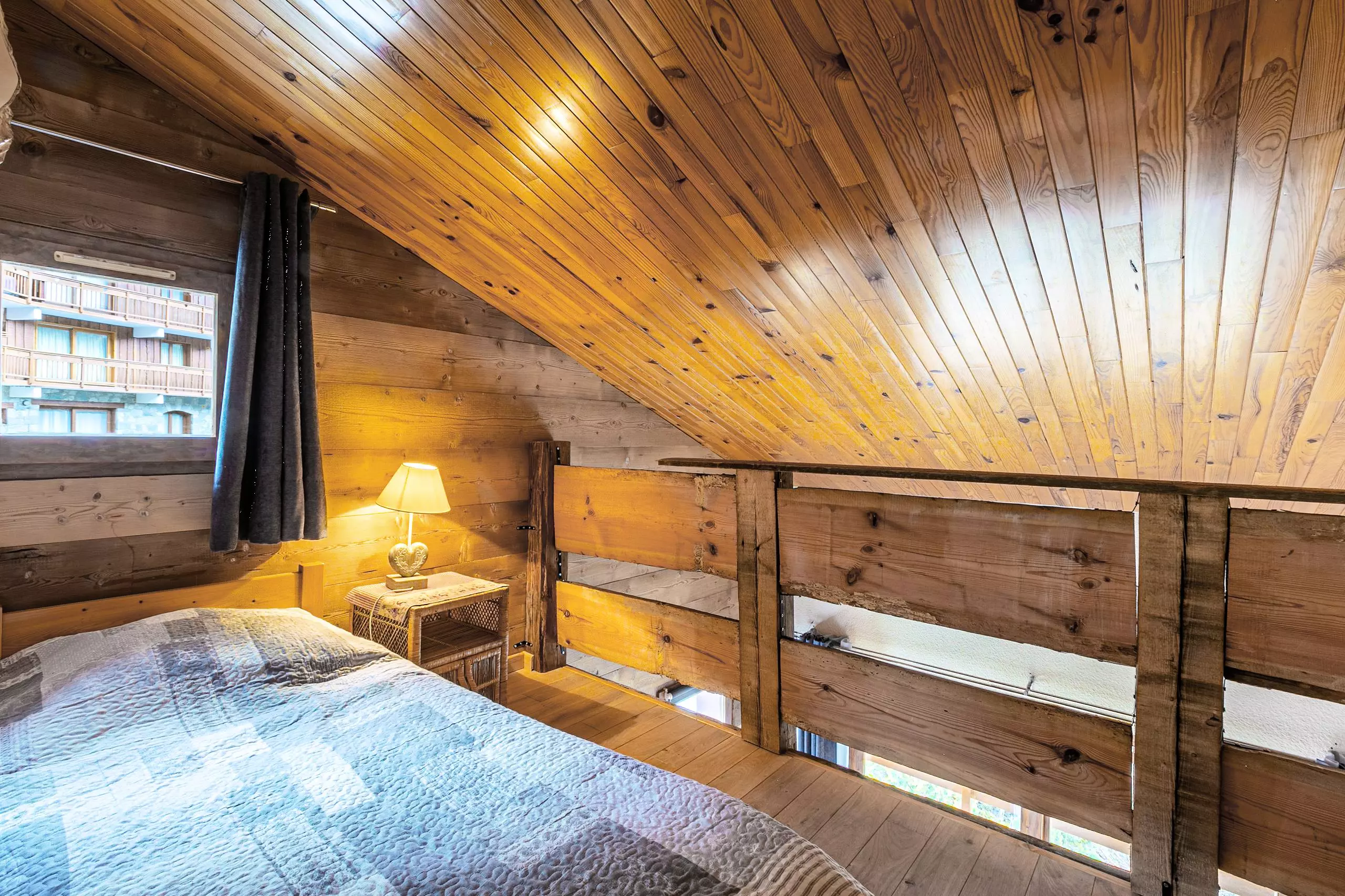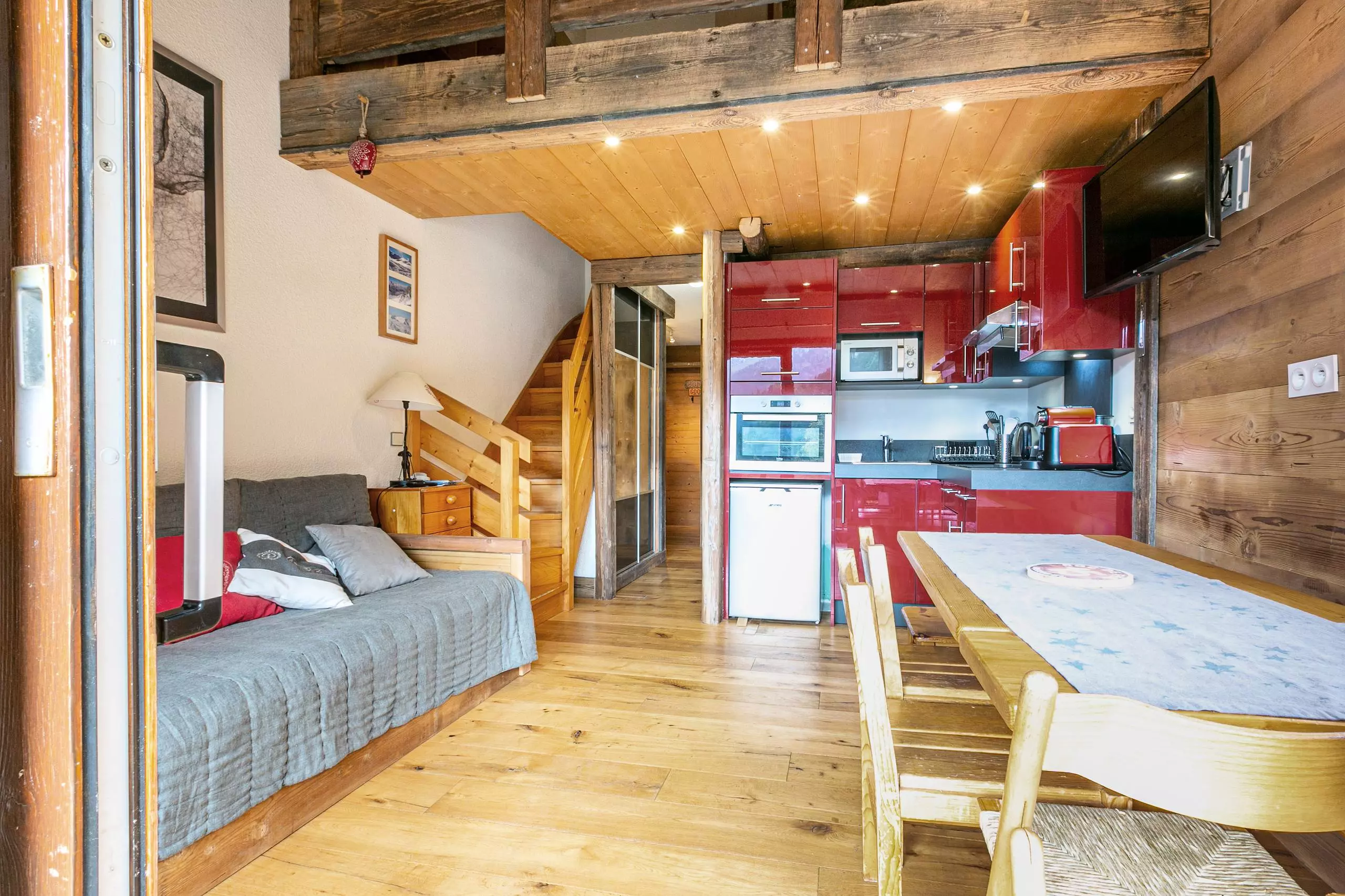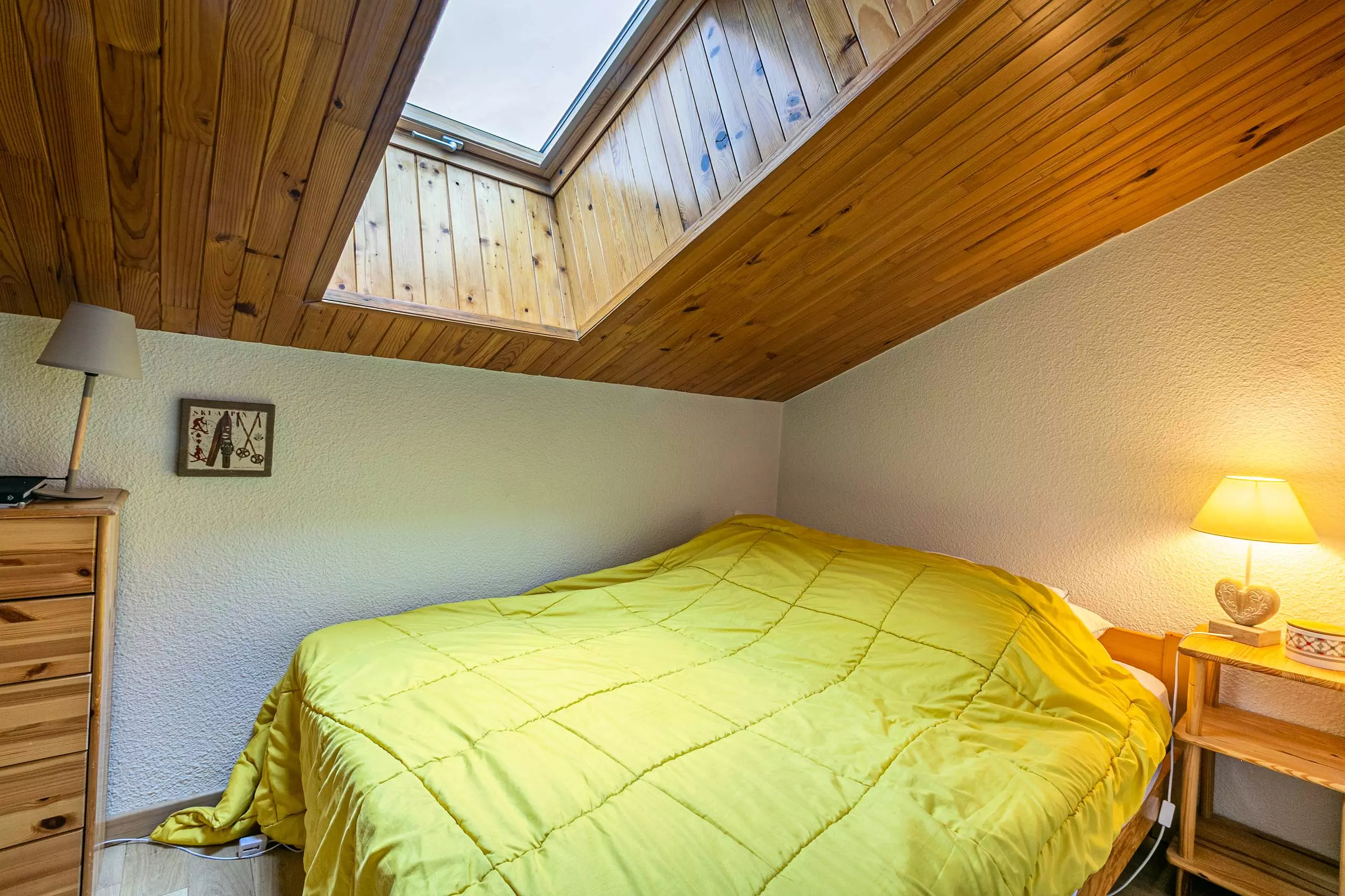 In the living room there is a sofa bed with a trundle bed (80x190) and a television. The kitchenette is equipped with an oven, microwave, extractor hood, fridge, dishwasher, induction hob, coffee maker, toaster and kettle. Next to the entrance is a cabin bedroom with a set of bunk beds (90x190). A shower room with WC. Upstairs, there is a bedroom with a double bed (140x190), a mezzanine with a single bed and a trundle bed (80x190) and a shower room with WC and washing machine. Balcony, south orientation, ski locker in the residence with boot dryer. Non-smoking apartment. Pets not allowed. 3rd floor.