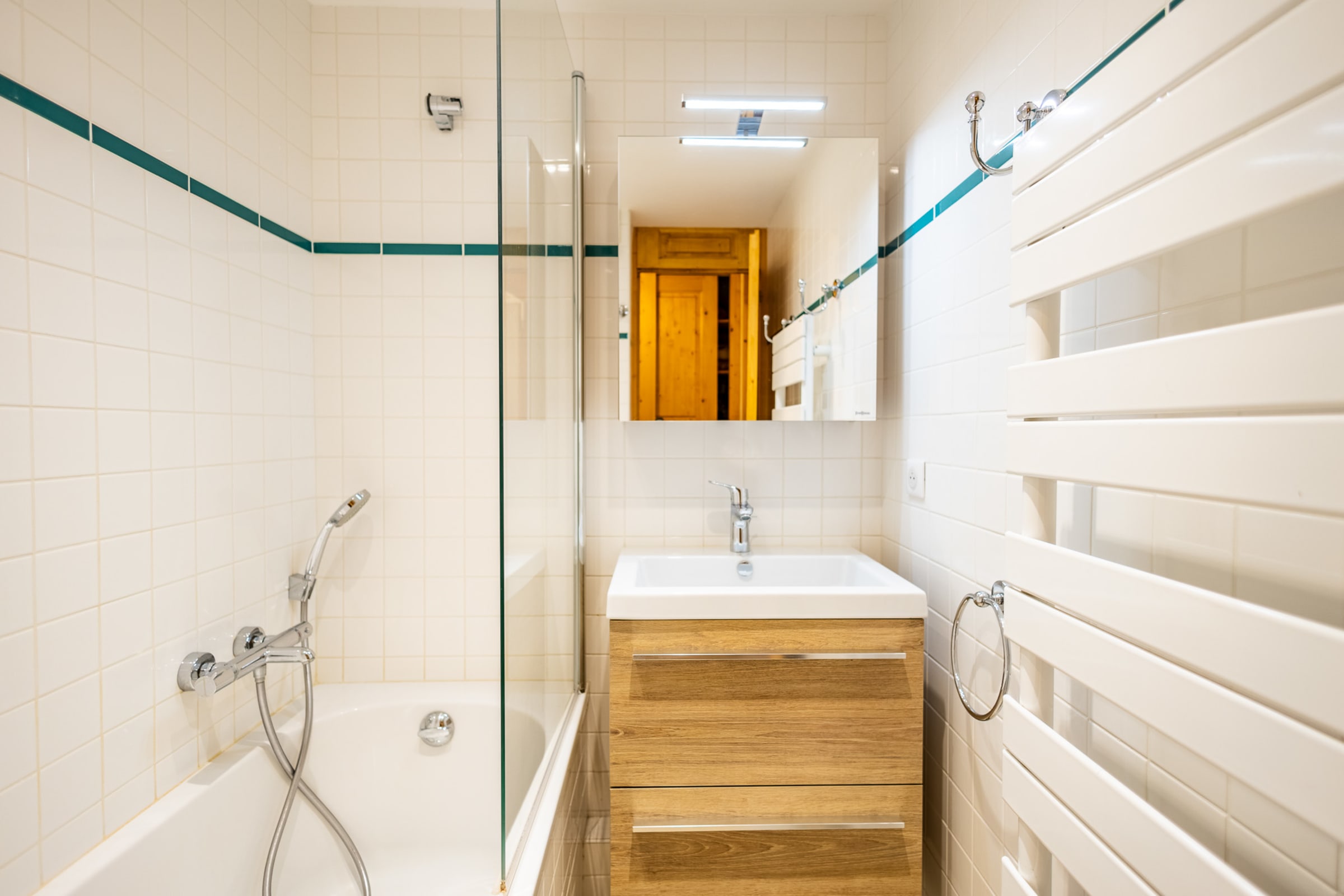 - Functional bathroom with shower and storage
