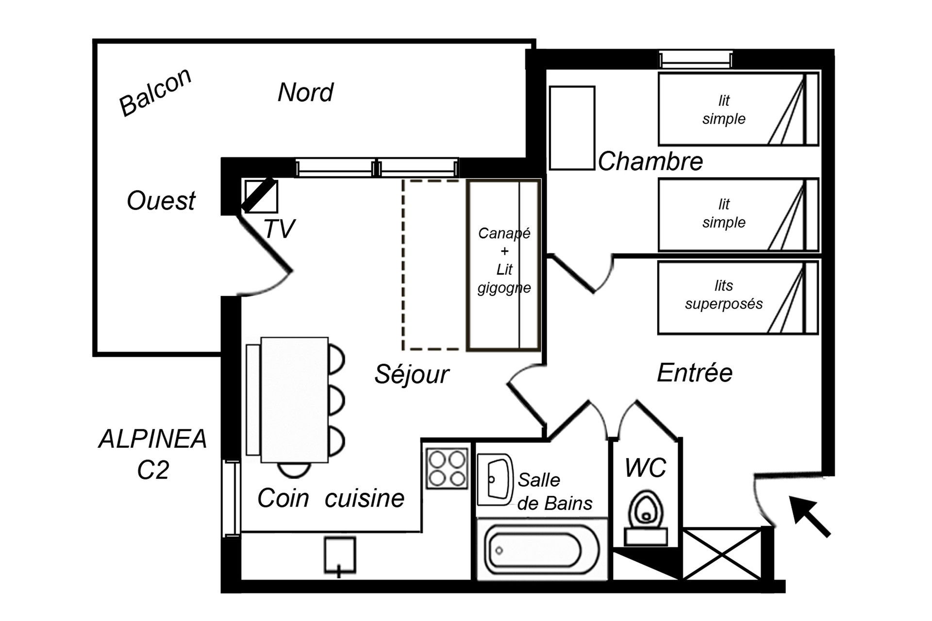 2 Rooms, 5/6 Persons, 32m², North & West Balcony, 2nd Floor with lift