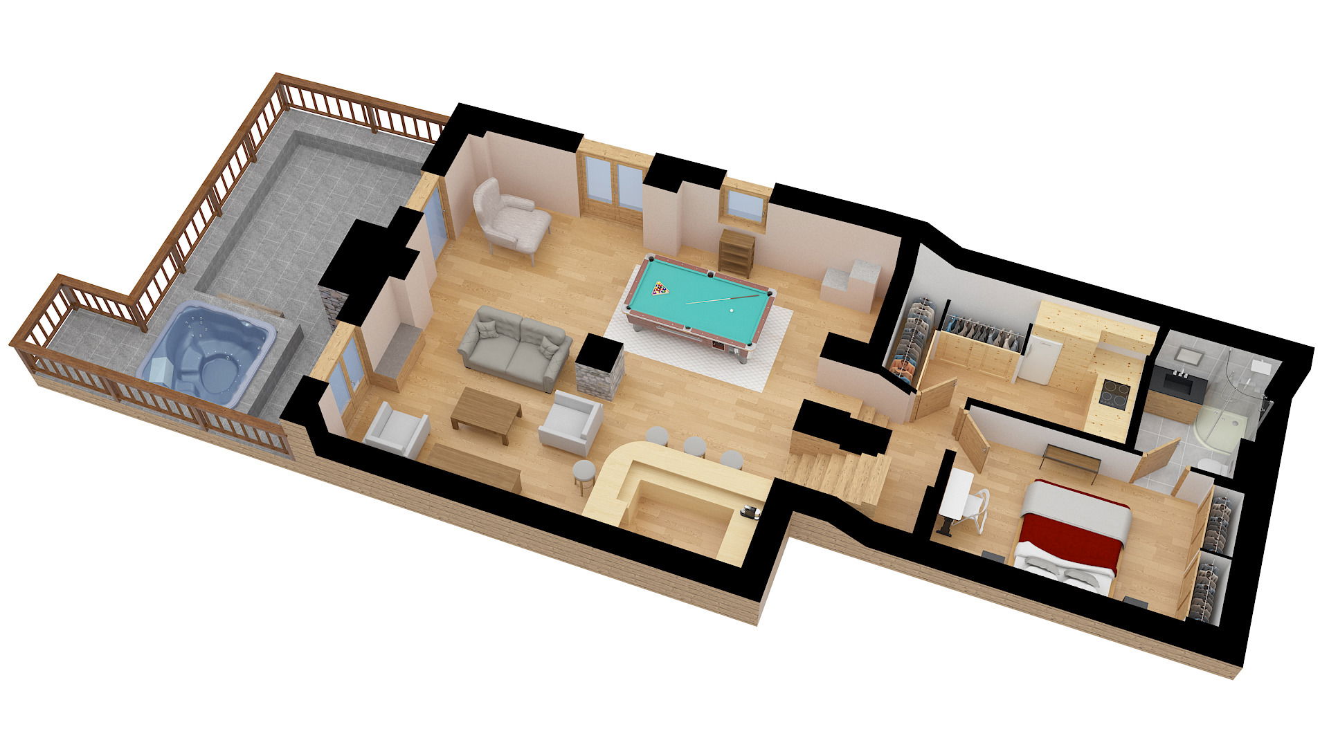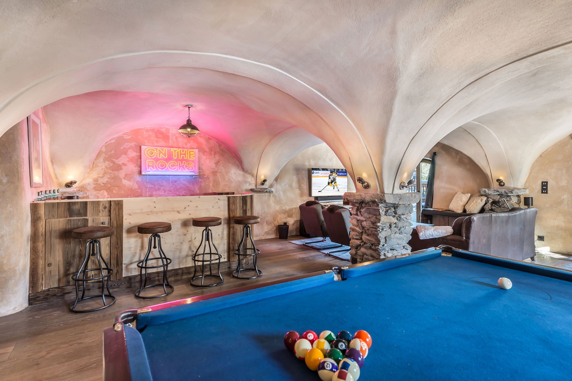 - Large vaulted living room with pool table, "apple" TV with "sonos" sound system, bar and outdoor jacuzzi